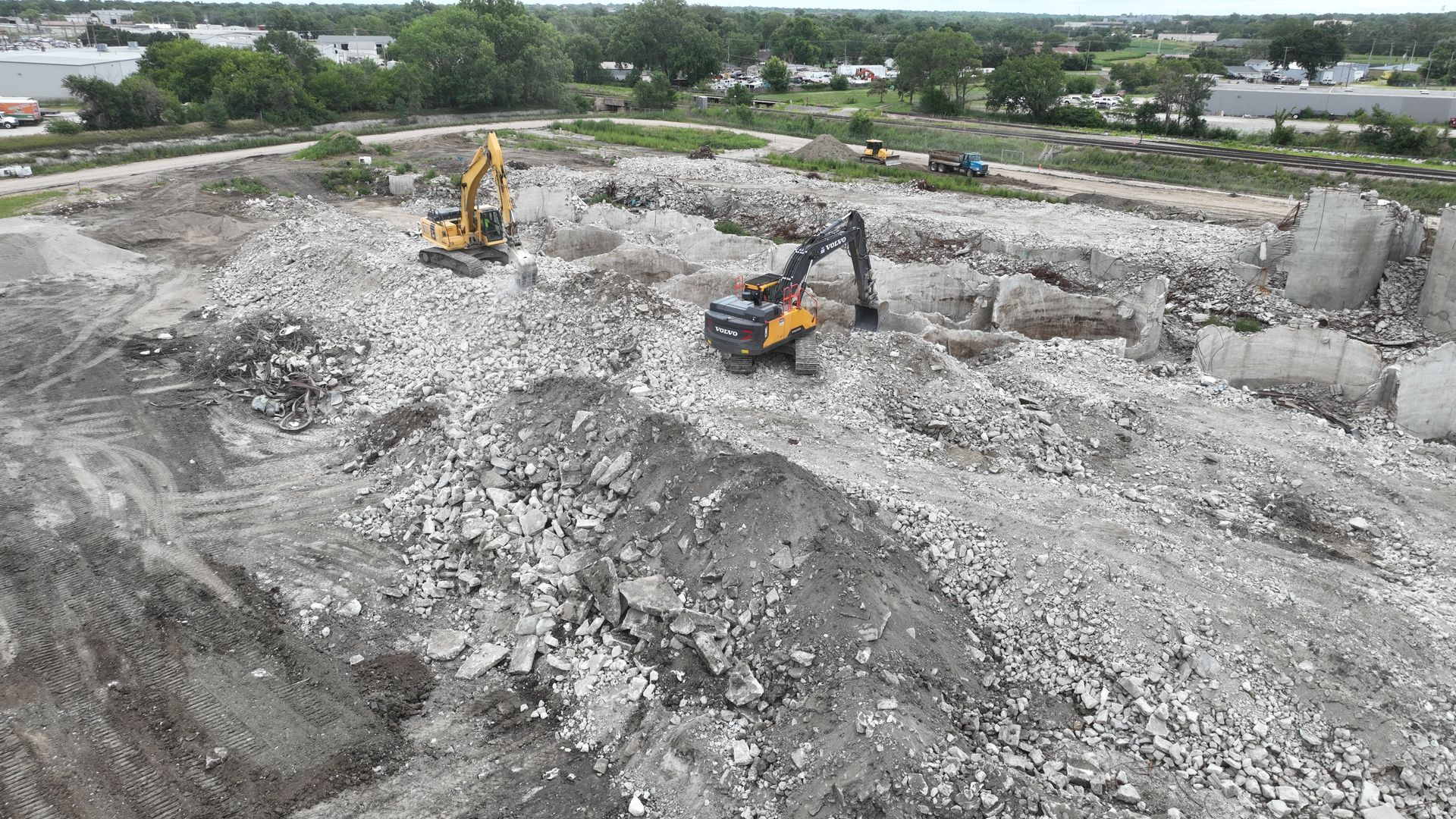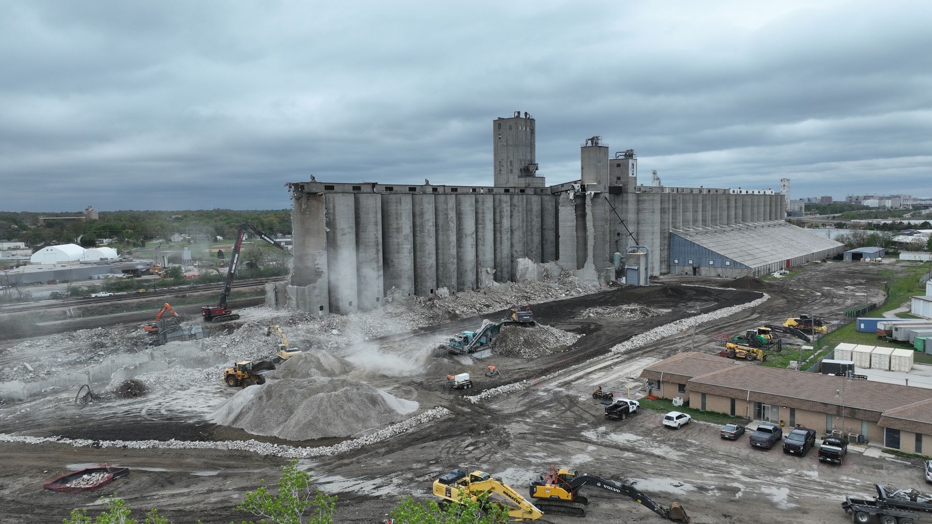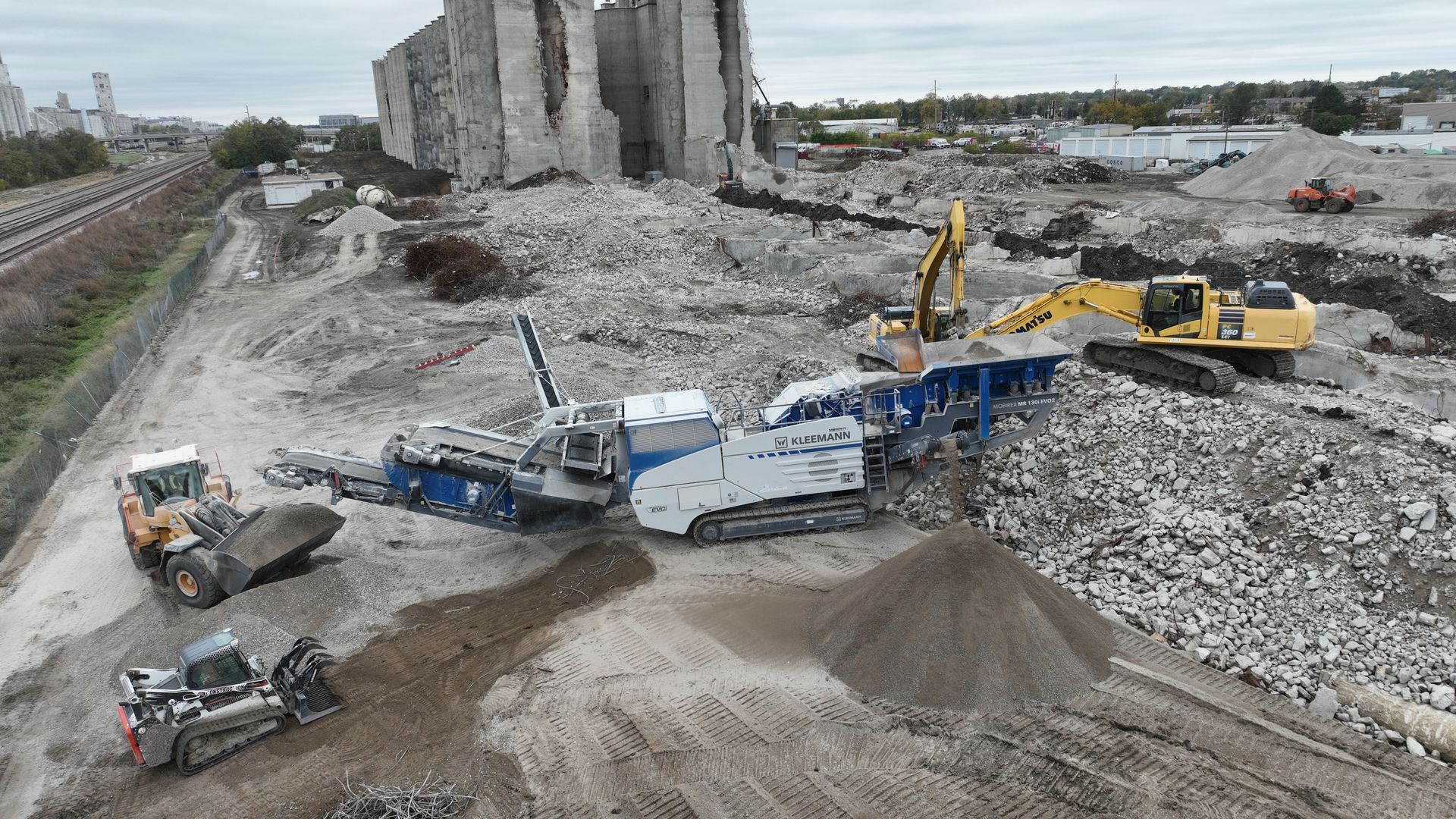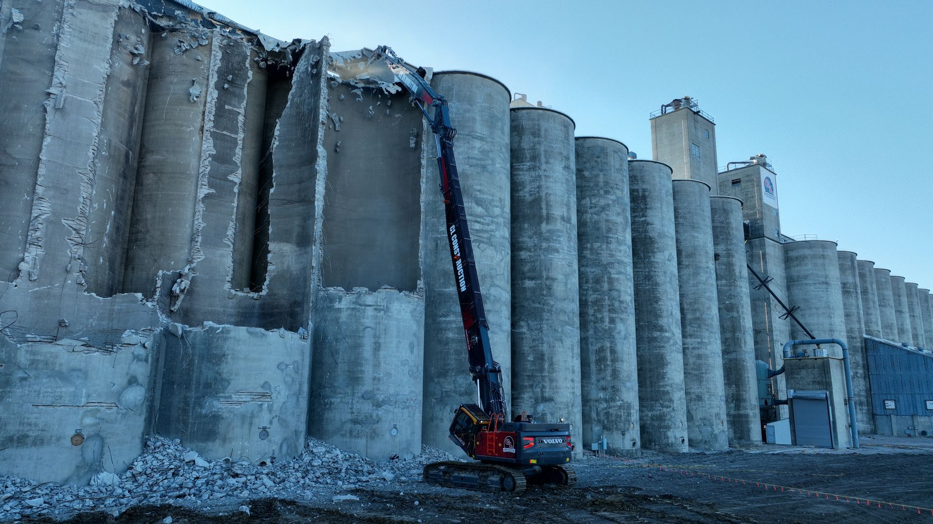 This project involved the controlled demolition of a grain elevator using a Volvo high-reach excavator, allowing for a safe and precise dismantling. Concrete materials were crushed on-site and resold for recycling, reducing waste and supporting sustainable reuse. The project began in October 2025.