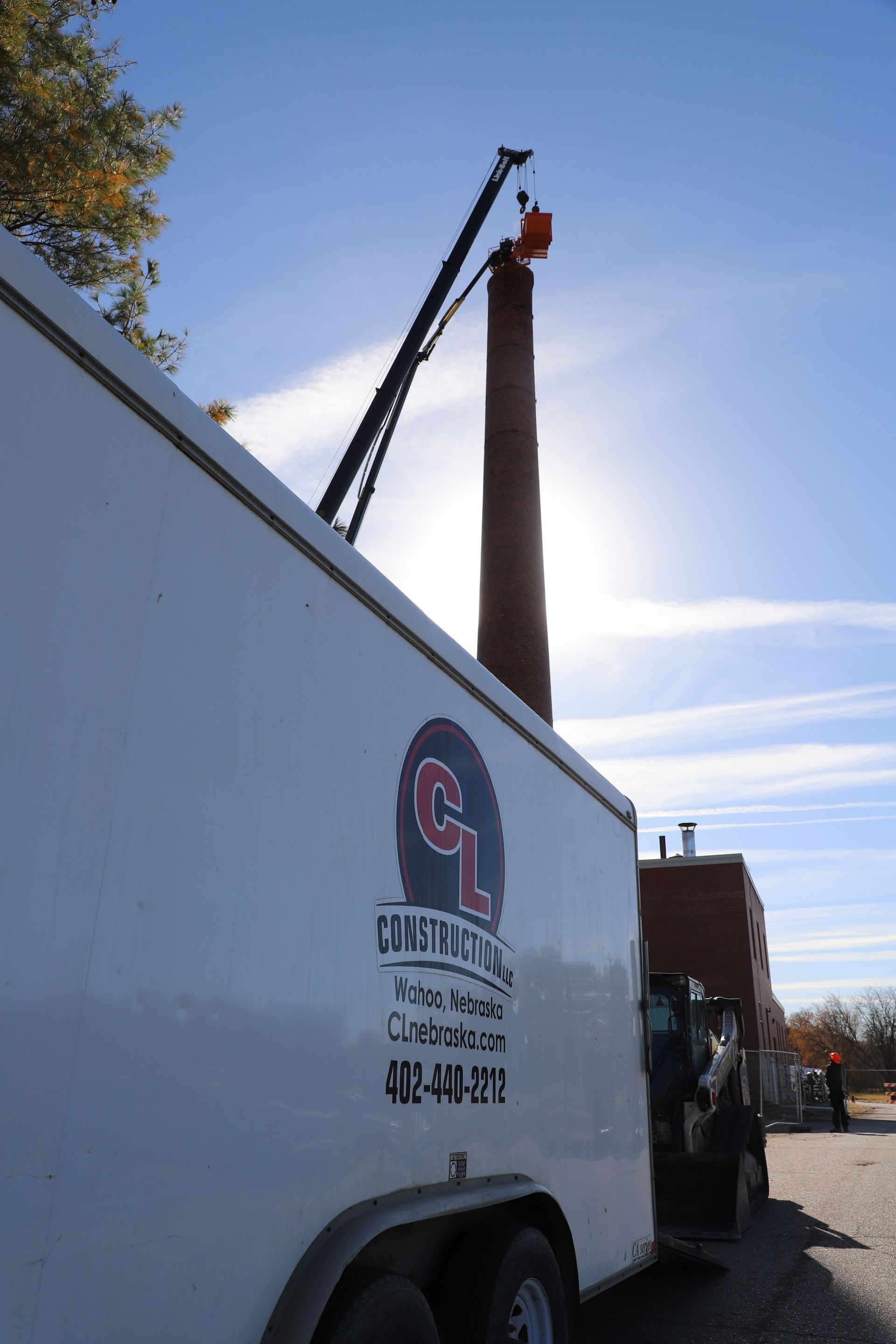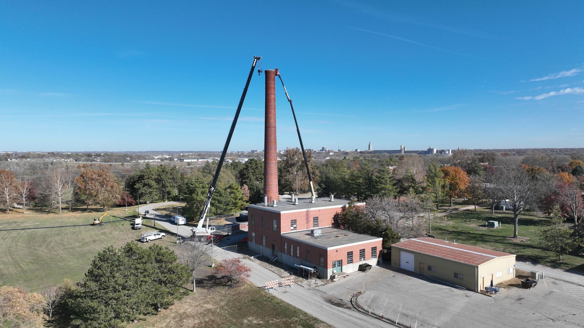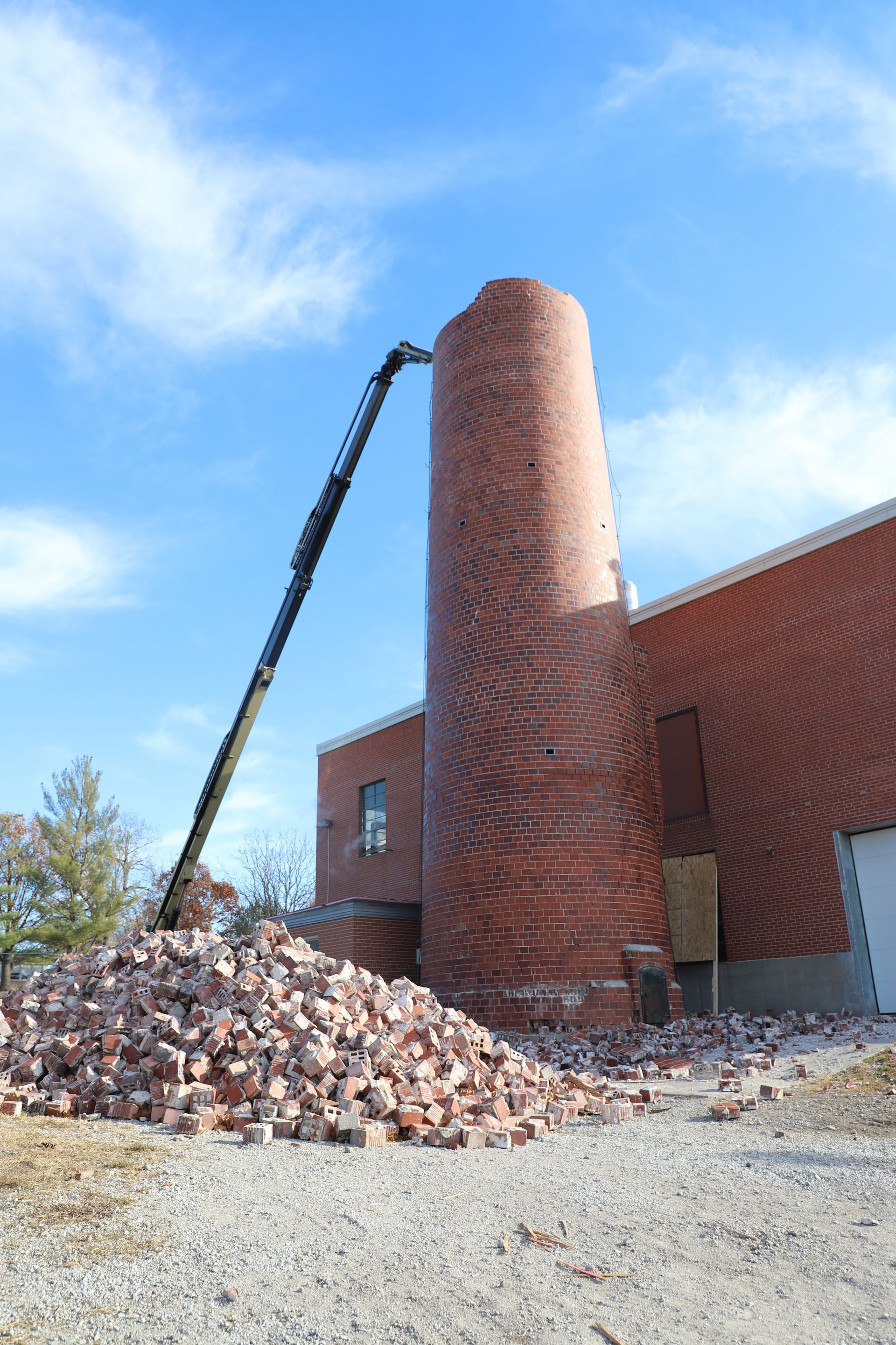 CL Construction completed the controlled demolition and removal of a 143‑foot tall brick smokestack at the Lincoln Regional Center Physical Plant. This project involved dismantling the existing masonry structure adjacent to active buildings with precision to ensure safety and protection of surrounding facilities.